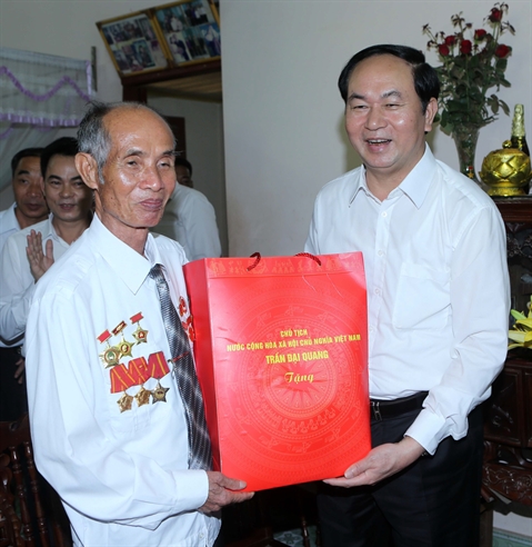 | Le président Trân Dai Quang (droite) offre un cadeau à un vétéran de Diên Biên. |