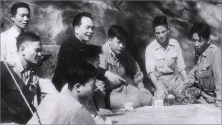 | Le général Vo Nguyên Giap en train de diriger une réunion avec ses commandants avant le lancement de la campagne de Diên Biên Phu en 1954. |