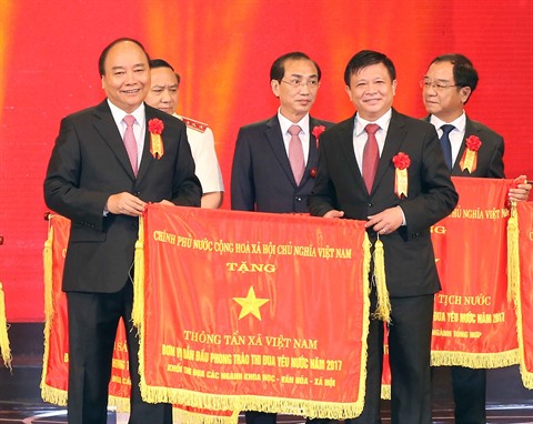 | Le Premier ministre Nguyên Xuân Phuc (gauche) remet le drapeau d'émulation du gouvernement à l'Agence Vietnamienne d’Information (VNA). |