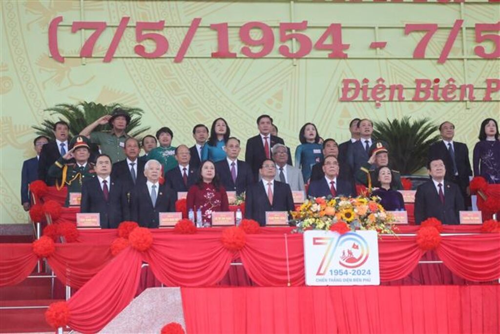 | Dirigeants participant à la cérémonie marquant le 70e anniversaire de la Victoire de Diên Biên Phu. |
