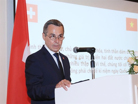 | Le vice-président suisse Ignazio Cassis lors de la célébration du 50e anniversaire de l'établissement des relations diplomatiques entre le Vietnam et la Suisse, le 5 août à Hanoï. |