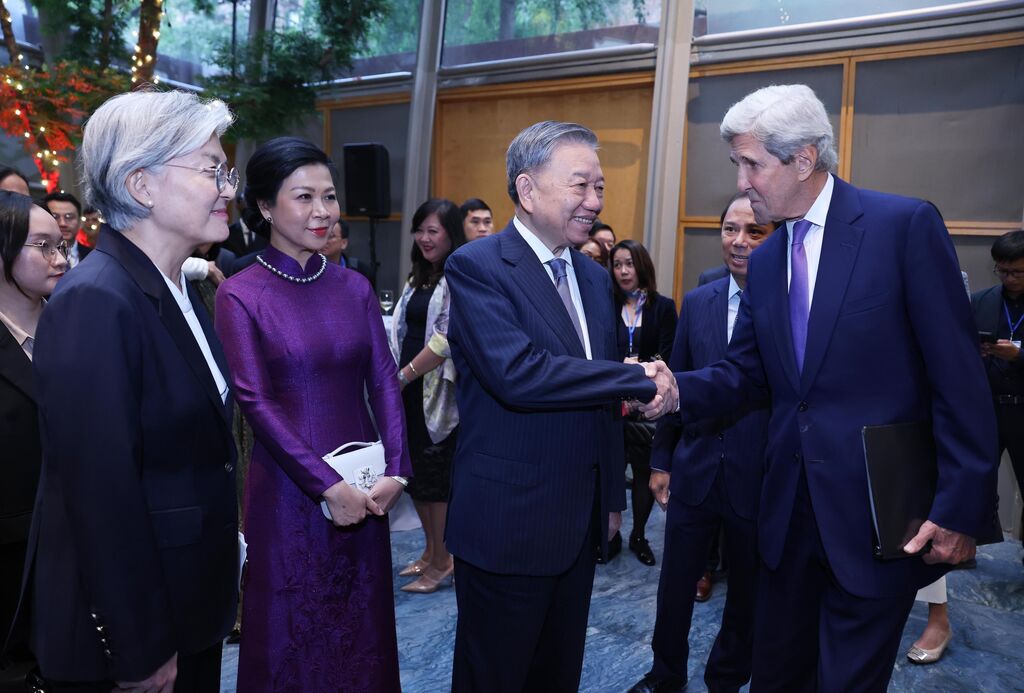 | Le secrétaire général et président Tô Lâm (2e à droite) et l'ancien secrétaire d'État, John Kerry (1er rang à droite), lors de l'événement pour célébrer le premier anniversaire de l'élévation des relations Vietnam - États-Unis au rang de partenariat stratégique intégral. |