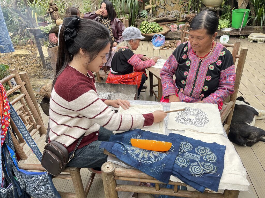 | Une visiteuse pratique la technique du batik (dessin à la cire d’abeille sur tissu) sous le guidage d'une femme H'mông. |