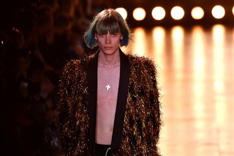 Sur le podium, une abondance de paillettes, de franges et de vestes dorées et argentées, portées par des mannequins androgynes.