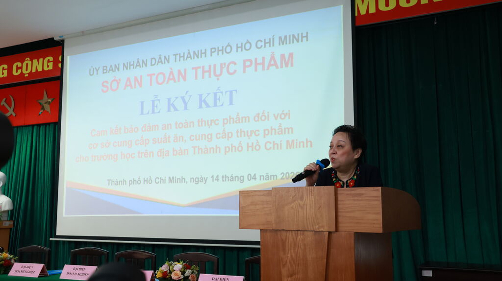 | Mme Phong Lan, directrice du Service municipal de la sécurité sanitaire des aliments, prend la parole lors de la cérémonie de signature. |