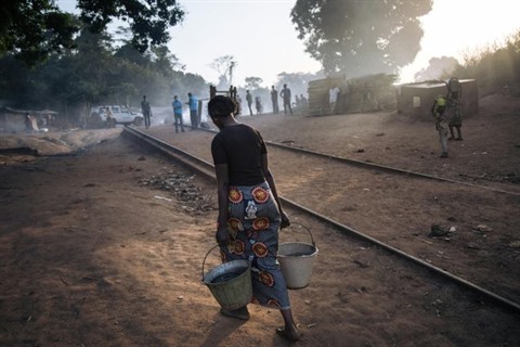 | Une réfugiée centrafricaine ramène de l'eau de la rivière vers le camp de réfugiés de Ndu en RDC, le 21 janvier. |