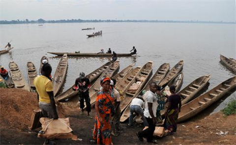 | Des personnes s'apprêtent à traverser le fleuve Oubangui à Bangui pour rejoindre la ville de Zongo, en RDC, le 10 octobre 2013. |