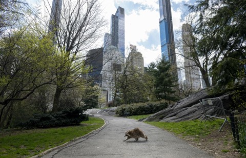 | Un raton laveur se promène dans un Central Park presque désert le 16 avril. |