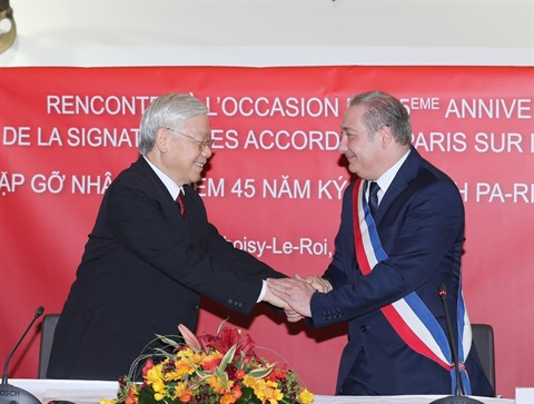 | Le secrétaire général Nguyên Phu Trong (gauche) et le maire de Choisy-le-Roi, Didier Guillaume. |