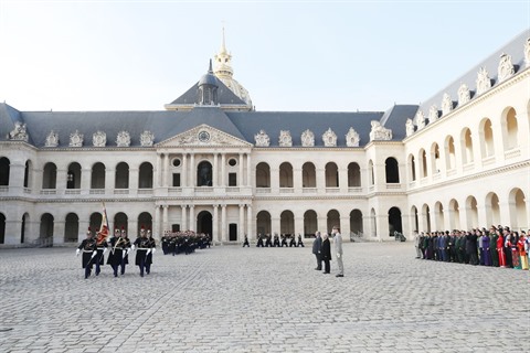 | Cérémonie d’accueil officielle du secrétaire général du PCV, Nguyên Phu Trong, le 26 mars, à l'Hôtel des Invalides à Paris. |