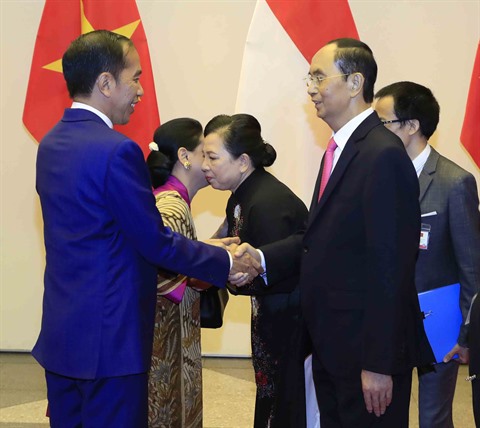 | Le président indonésien Joko Widodo et son épouse (gauche) reçus par le président Trân Dai Quang et son épouse, le 11 septembre à Hanoï. |