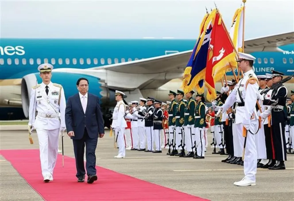 | Le Premier ministre Pham Minh Chinh passent en revue la garde d'honneur, le 30 juin à l'aéroport militaire de Seongnam à Séoul. |