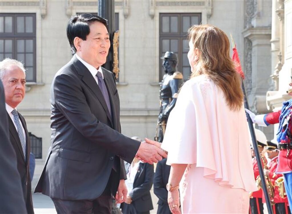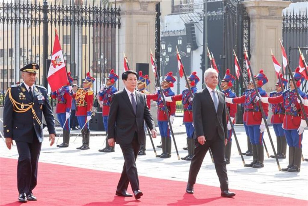 | Le président vietnamien Luong Cuong et son homologue péruvienne Dina Ercilia Boluarte Zegarra, lors de la cérémonie d'accueil solennelle, le 13 novembre à Lima. |