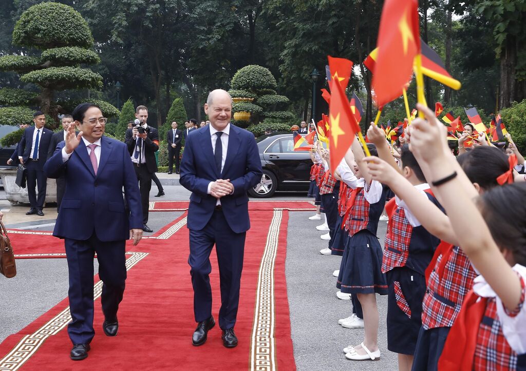 | Le PM Pham Minh Chinh (gauche) accueille le chancelier allemand Olaf Scholz, dimanche 13 novembre à Hanoï. |