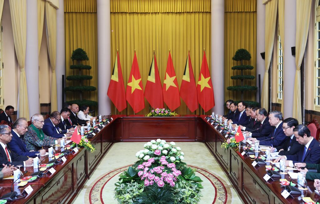 | Entretien entre le président Tô Lâm (3e à droite) et son homologue du Timor-Leste, José Ramos-Horta (3e à gauche). |