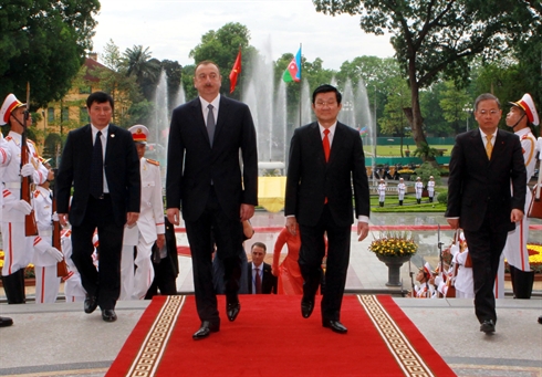 | Le président vietnamien Truong Tân Sang (droite) à la cérémonie d’accueil officielle en l’honneur du président de l'Azerbaïjan, Ilham Aliyeve. |