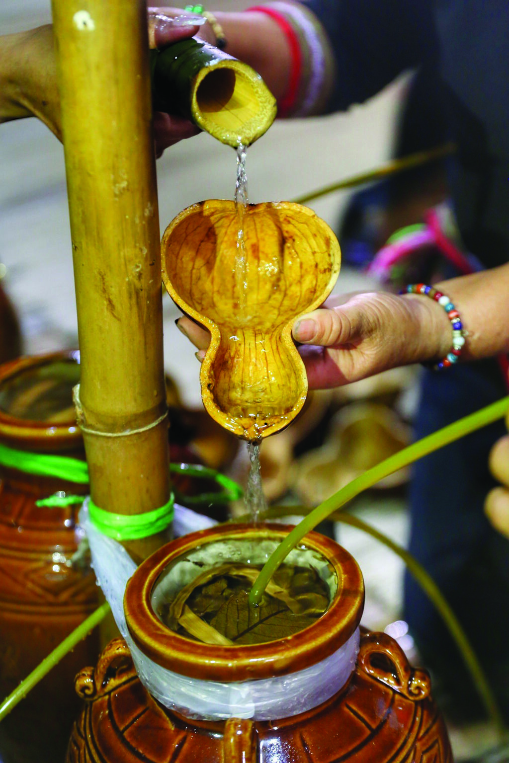 Les offrandes préparées pour le culte comprennent un cochon, un coq, des anneaux, bagues et plateaux en cuivre, un lilas du Japon, un bananier, des cannes à sucre, etc. Les jarres sont accrochées à des tronçons d’arbres bien solides pour éviter qu’elles ne soient renversées ou cassées. Le culte est dirigé par un chaman.