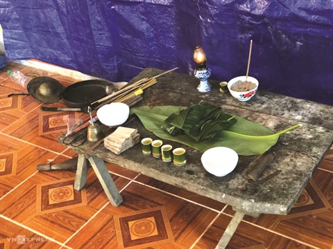 | Des offrandes simples : du riz, de l’alcool et de la viande emballée dans des feuilles