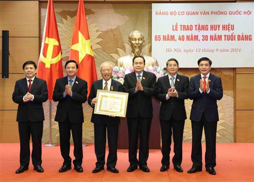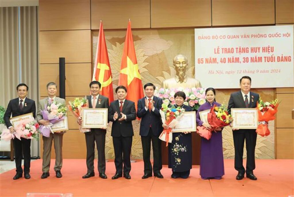 Le vice-président de de l’Assemblée nationale Nguyên Khac Dinh a remis l'Insigne des 40 ans du Parti à quatre membres du Parti ; Le secrétaire du comité du Parti du bloc des organes centraux Nguyên Van Thê, quant à lui, a remis l'Insigne des 30 ans du Parti à six membres du Parti du Bureau de l’Assemblée nationale.