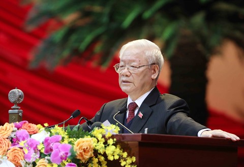 | Nguyên Phu Trong, secrétaire général du Parti et président du Vietnam, prend la parole à l'ouverture du XIIIe Congrès. Photo : VNA/CVN |