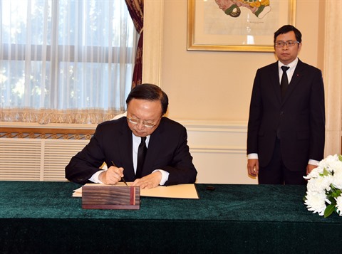 | Yang Jiechi, membre du politburo du Comité central du Parti communiste chinois (PCC), livre un message dans le registre de condoléances à l’ambassade du Vietnam. |