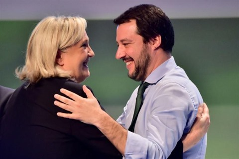 Comme son allié italien et le Premier ministre national-conservateur hongrois Viktor Orban, Marine Le Pen se place dans le camp des "nationaux", face aux "mondialistes" incarnés à ses yeux par Emmanuel Macron, qui "panique". Mais contrairement au FPÖ, parvenu au pouvoir en Autriche avec les conservateurs, ou à la Ligue italienne, le RN peine à trouver des alliés. À défaut d'avoir convaincu le souverainiste Nicolas Dupont-Aignan, Marine Le Pen promet une liste "de rassemblement" où pourrait figurer l'ancien ministre LR Thierry Mariani, qui tarde à se décider.