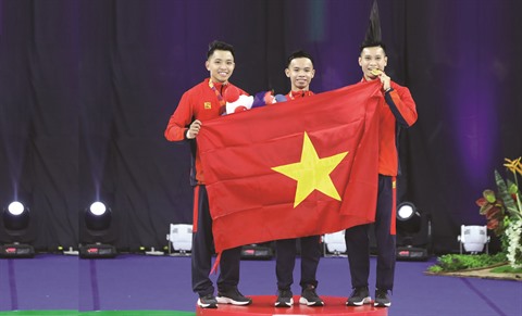 | Le trio Hoài Ân, Chê Thanh et Viêt Anh en compétition aux SEA Games 30. |