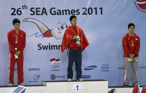 | Le nageur Hoàng Quy Phuoc, sur la plus haute marche du podium, lors des SEA Games 26 en Indonésie en novembre 2011. |