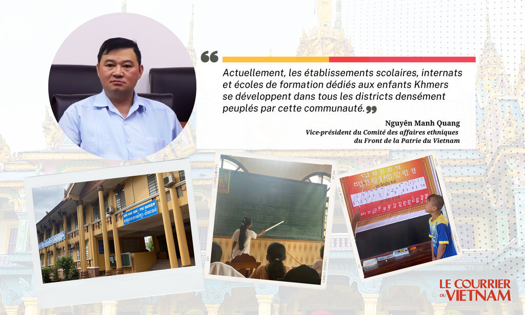 Selon Nguyên Manh Quang, chef adjoint du Comité des affaires ethniques du Comité central du Front de la Patrie du Vietnam, des politiques et régimes spécifiques ont été mis en place par le Parti et l’État en matière de santé, d’éducation, d’accès à l’eau potable, à l’électricité, à la formation professionnelle, à l’information et aux connaissances juridiques. Actuellement, des établissements scolaires, des internats et des écoles de formation dédiés aux enfants Khmers se développent dans tous les districts densément peuplés par cette communauté. En plus de l’exemption des frais de scolarité et de l’octroi d’une assurance santé, les élèves Khmers bénéficient d’une aide financière pour les repas, les fournitures scolaires et les uniformes.