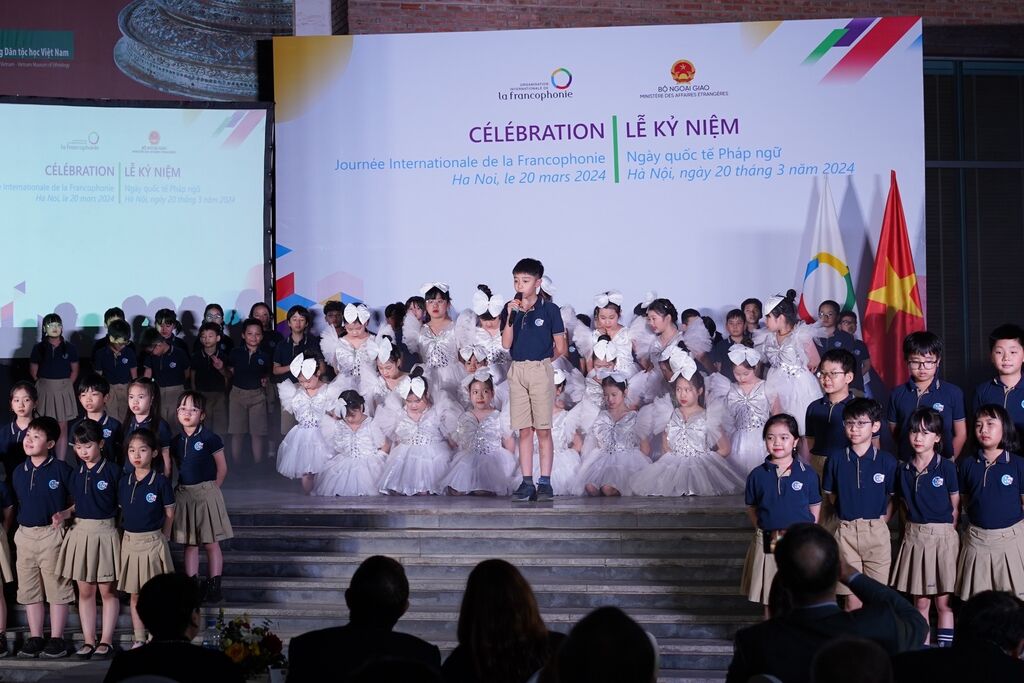 | Performance des élèves de l'école primaire Doàn Thi Diêm lors de la cérémonie officielle de célébration de la Journée internationale de la Francophonie, tenue le 20 mars 2024 au Musée d'ethnographie du Vietnam, à Hanoï. |