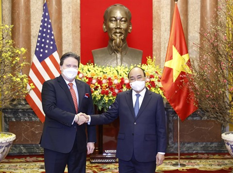 | Le président vietnamien Nguyên Xuân Phuc (droite) et l’ambassadeur des États-Unis au Vietnam, Marc Knapper, le 11 février à Hanoï. |