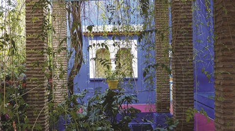 Peintre français, Jacques Majorelle (1882-1962). En 1922, il a la bonne idée d’acheter quelques hectares dans une palmeraie de Marrakech (Maroc), et d’y faire construire sa maison et son atelier inspirés du style Le Corbusier. Passionné de botanique, il y plante des espèces rares ramenées de ses voyages. Puis un jour de 1937 il a l’idée de jouer les alchimistes en mêlant des pigments outremer et violaces. Le bleu M. Majorelle est né. Il habille les murs de ce bleu intense et hypnotique. Après sa mort, la maison sombre dans l’oubli et l’abandon.