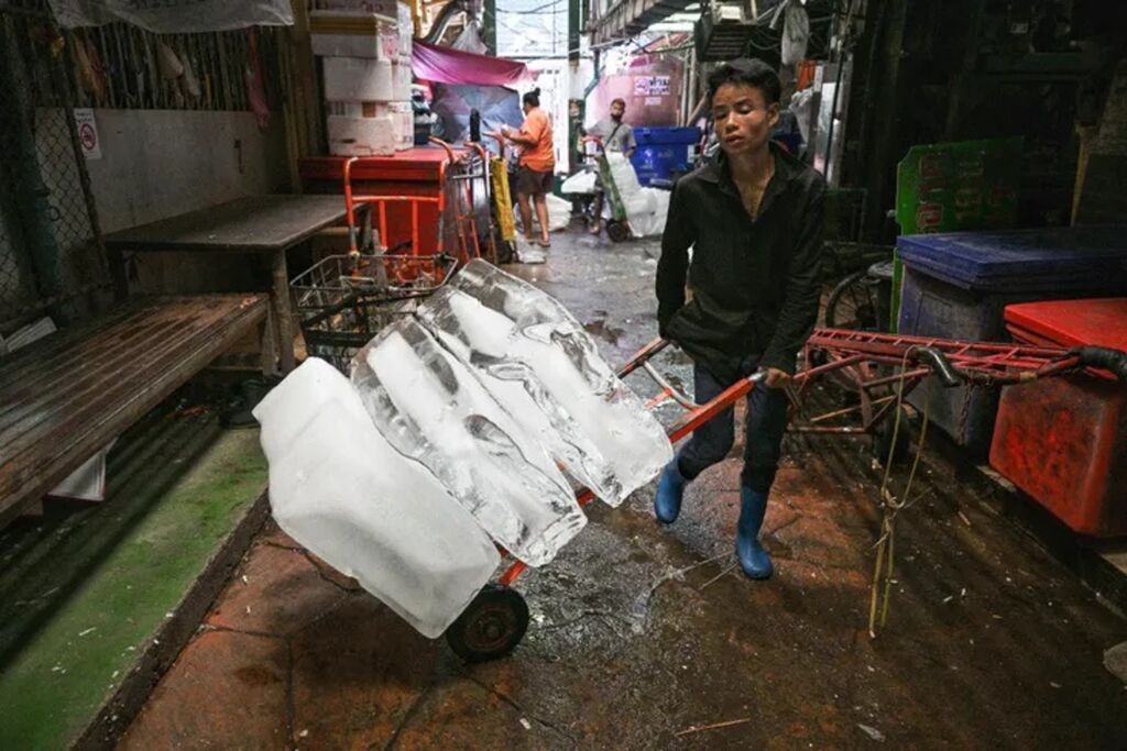 | Un vendeur transporte des blocs de glace pendant des fortes chaleurs à Bangkok, le 18 avril 2024 en Thaïlnade. |