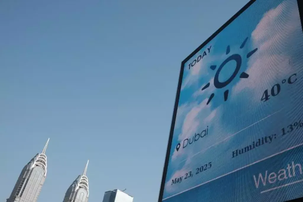 | Un panneau affiche un bulletin météo et une température de 40 degrés Celsius à Dubaï, le 23 mai 2025 aux Émirats arabes unis. |
