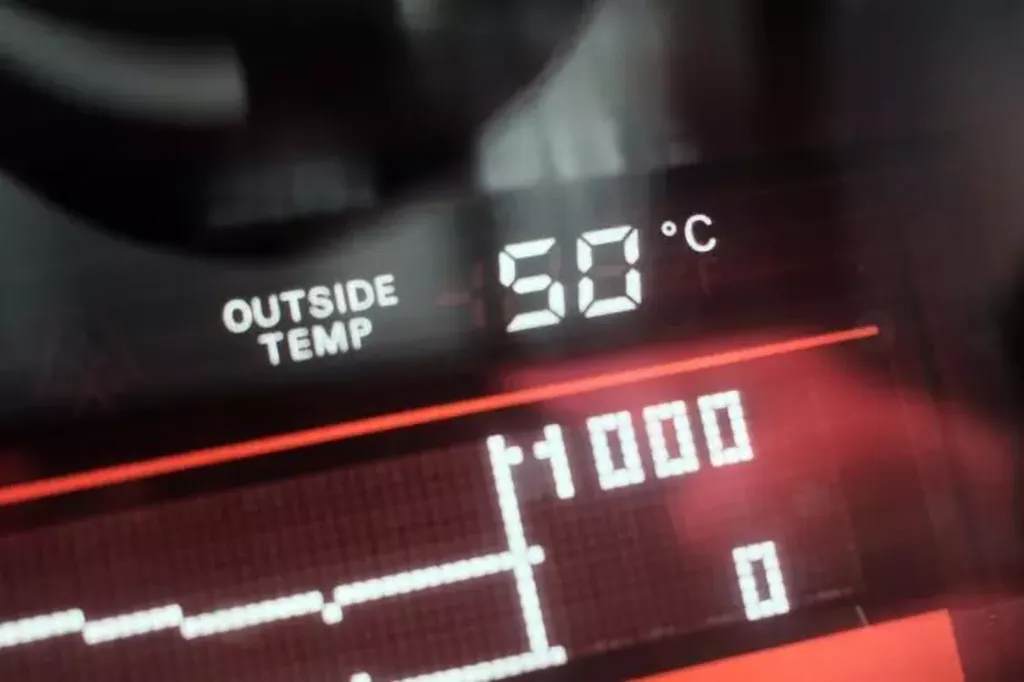 | Un écran de tableau de bord d'un véhicule affiche une température extérieure de 50 degrés Celsius à Dubaï, le 23 mai 2025 aux Émirats arabes unis. |
