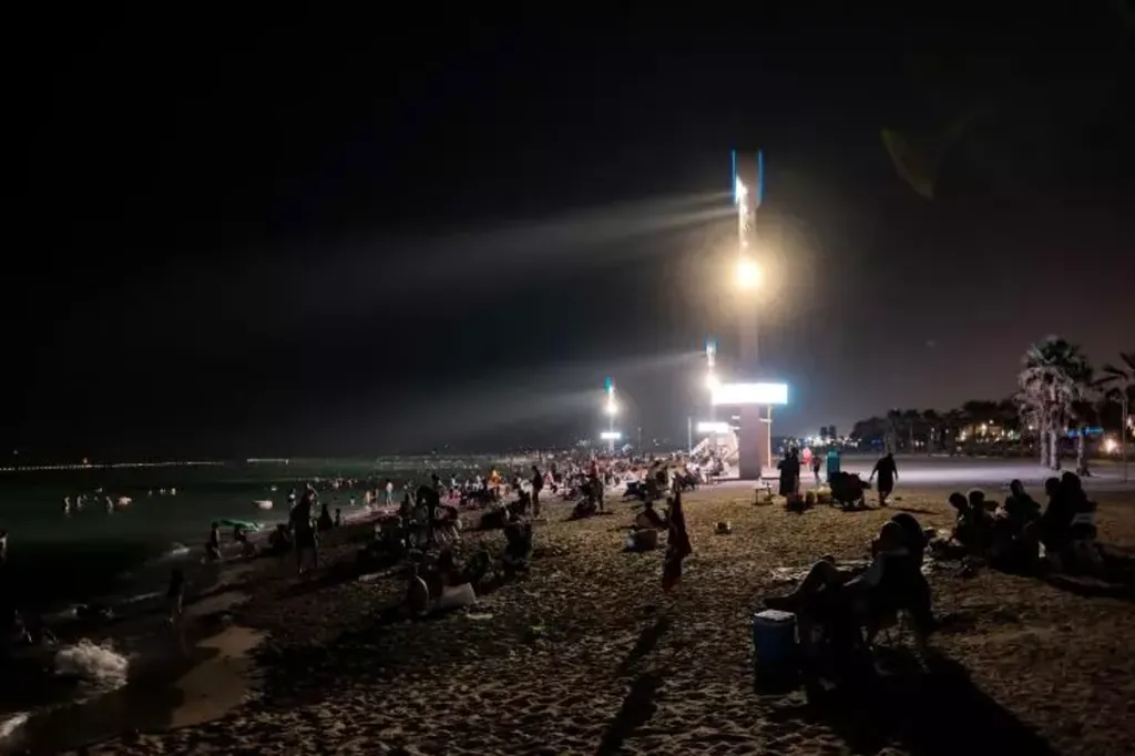| Des projecteurs illuminent la plage d'Umm Suqeim à Dubaï alors que des personnes se rafraîchissent la nuit, le 23 mai 2025 aux Émirats arabes unis. |