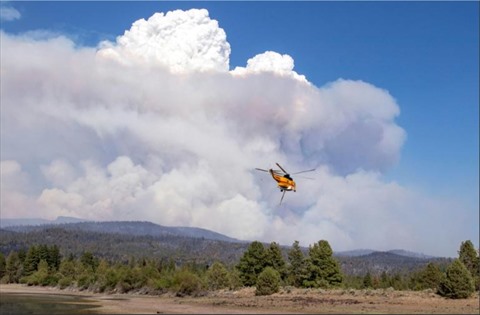 | Un hélicoptère chargé d'eau vole près du Bootleg Fire, dans l'Oregon, le 15 juillet 2021. |