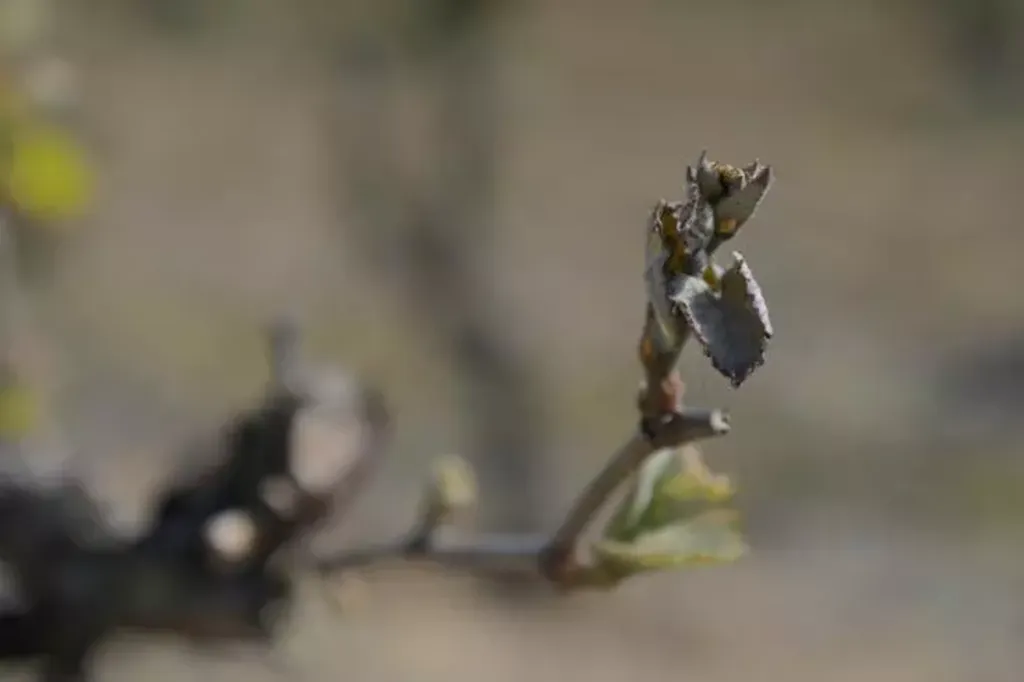 | Un bourgeon de vigne touché par un épisode de gel tardif le 9 avril 2021 à Parcay-Meslay, dans le Centre de la France. |