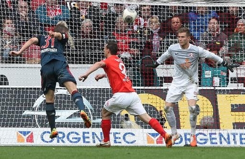 | Le milieu de terrain du Bayern, Bastian Schweinsteiger (gauche), inscrit un but de la tête sur le terrain de Mayence, le 22 mars. Photo : AFP/VNA/CVN |