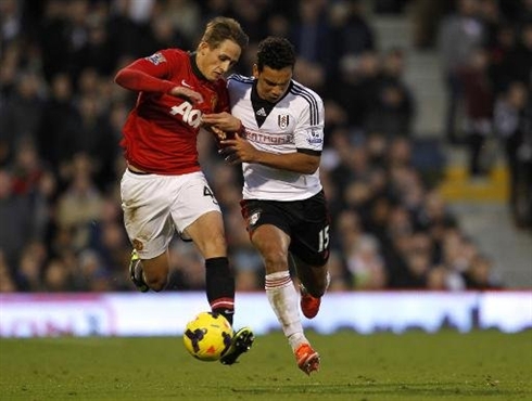 | Le mileu du terrain belge de Manchester United, Adnan Zanuzaj (gauche), à la lutte avec l'Anglais de Fulham, Kieran Richarson, le 2 novembre à Londres. Photo : AFP/VNA/CVN |
