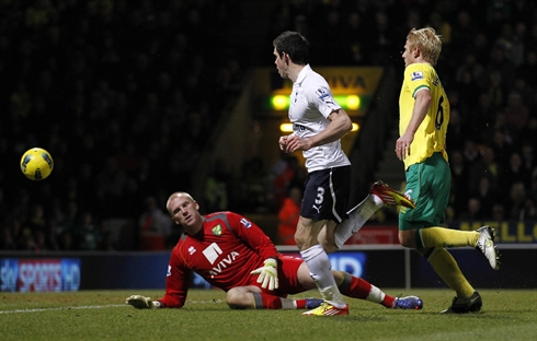 | Grâce à un exellent Bale (centre), auteur d'un doublé à Norwich (2-0), Tottenham conforte sa place sur le podium. |