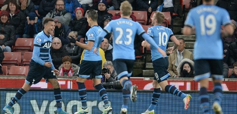 Pendant ce temps, Harry Kane lui a répondu sur le terrain de Stoke grâce à une frappe enroulée du droit, dès la 9e minute, puis un but de près à la 71e, sur un service impeccable de Lamela. Kane est seul en tête du classement des buteurs avec 24 réalisations. Le jeune Dele Alli, 20 ans, 2e buteur du club avec 10 buts, a inscrit lui aussi un doublé : une subtile balle piquée à la 67e, puis un but au cœur de la surface (82e).