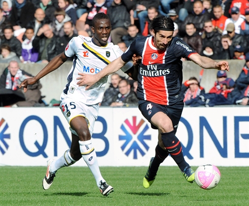 | Le milieu de terrain de PSG, Milan Bisevac (droite), à la lutte contre l’attaquant de Sochaux, Modibo Maiga, le 22 avril au Parc des Princes. Photo : AFP/VNA/CVN |