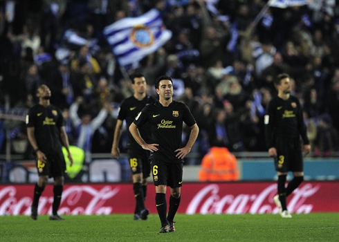 | La tristesse des joueurs du FC Barcelone à l’issue d’un derby contre l''Espanyol, le 8 janvier à Cornella. |