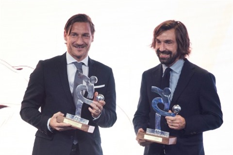 | Les anciens joueurs italiens Francesco Totti (gauche) et Andrea Pirlo reçoivent chacun un trophée pour leur carrière, le 3 décembre 2018 à Milan. |