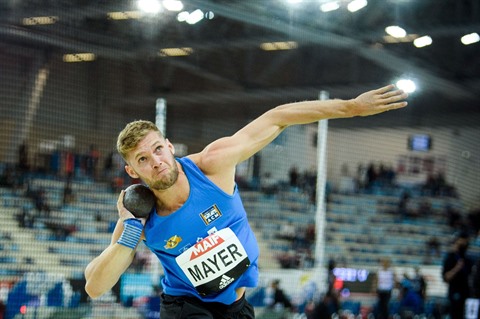 | Kevin Mayer, au lancer du poids, lors des Championnats de France en salle, le 26 février à Miramas. |
