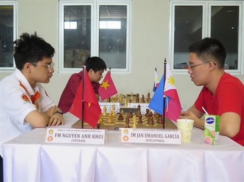 | Le jeune joueurs d'échecs Anh Khôi (gauche) gagne contre son adversaire Philippin. |