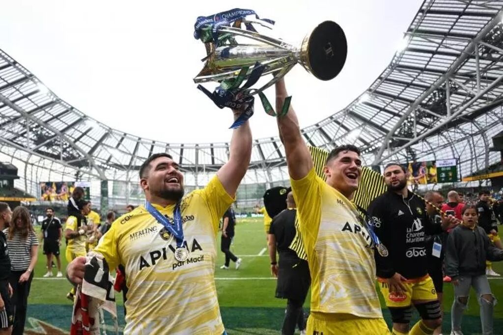| Les Rochelais Joël Sclavi (gauche) et Paul Boudehent vainqueurs de la Champions Cup contre le Leinster, le 20 mai à Dublin. |