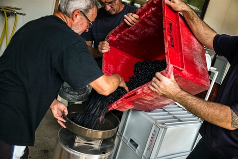 | Les grappes de raisin déchargées dans des cuves en modèle réduit au Château de l’Eclair à Liergues |