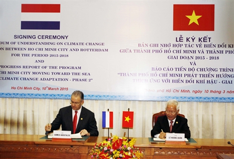 | Cérémonie de signature d'un aide-mémoire du programme de coopération pour la résilience au changement climatique de la phase 2015-2018 entre Hô Chi Minh-Ville et Rotterdam, le 10 mars dans la mégapole du Sud. |